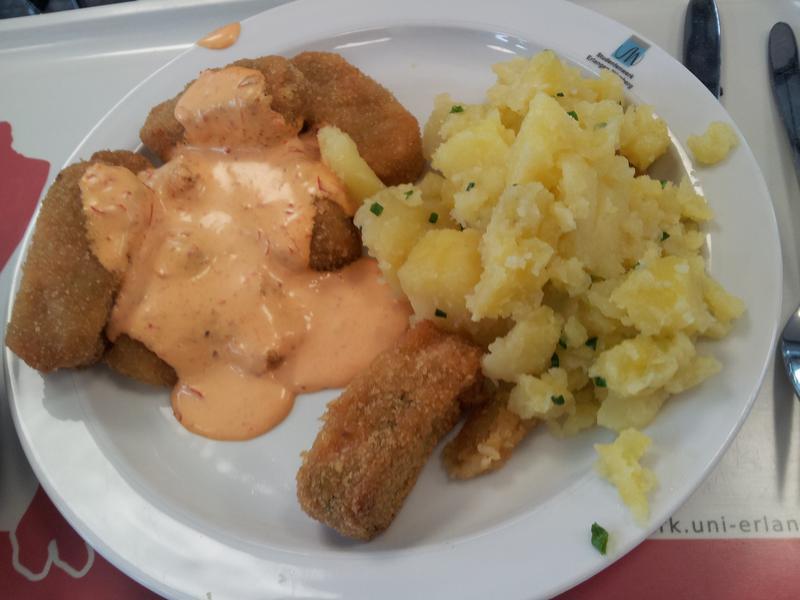 Panierte Gemüsestückchen ganz lecker, Kartoffeln hätten noch ein Weilchen länger kochen dürfen.
