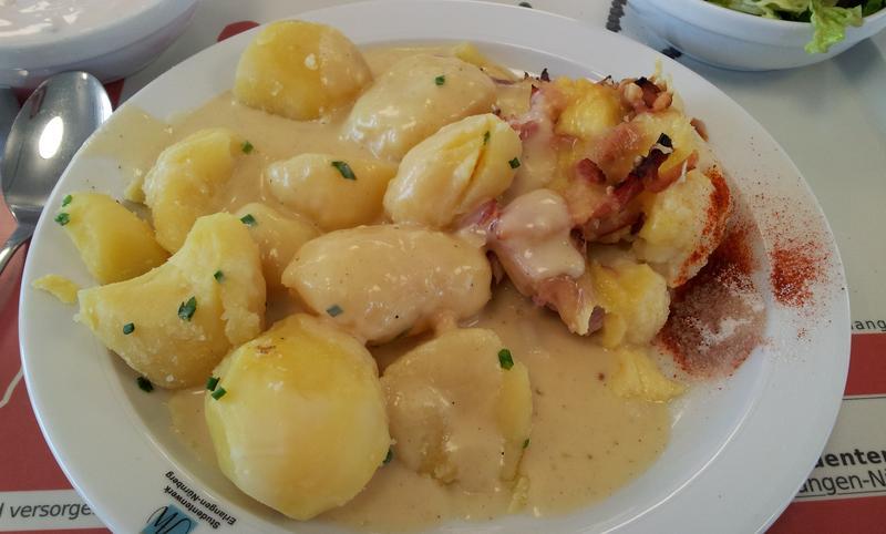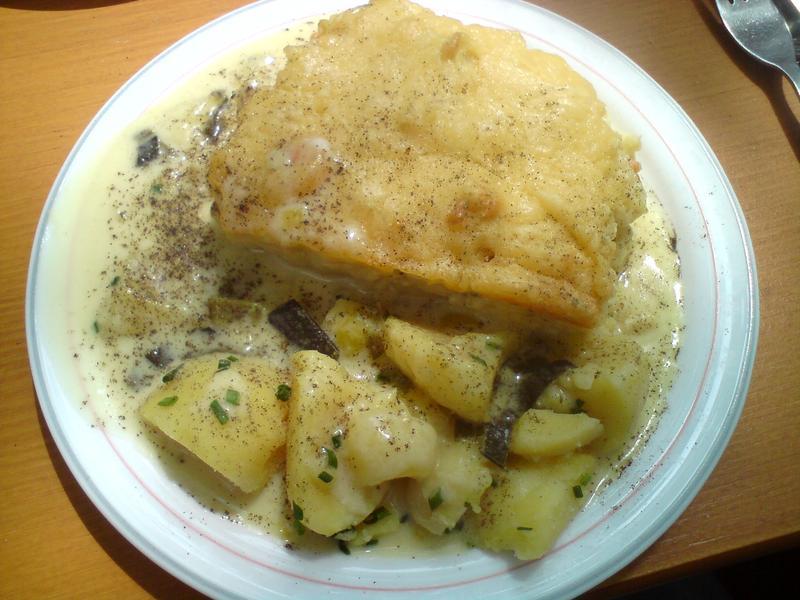 | Es war Blumenkohl, Schinken und Käse, aber nicht überbacken, dadurch optisch nicht so schön, aber dennoch schmackhaft. Dazu Kartoffeln und ein Sahnesoße. Insgesamt Note 2- | |