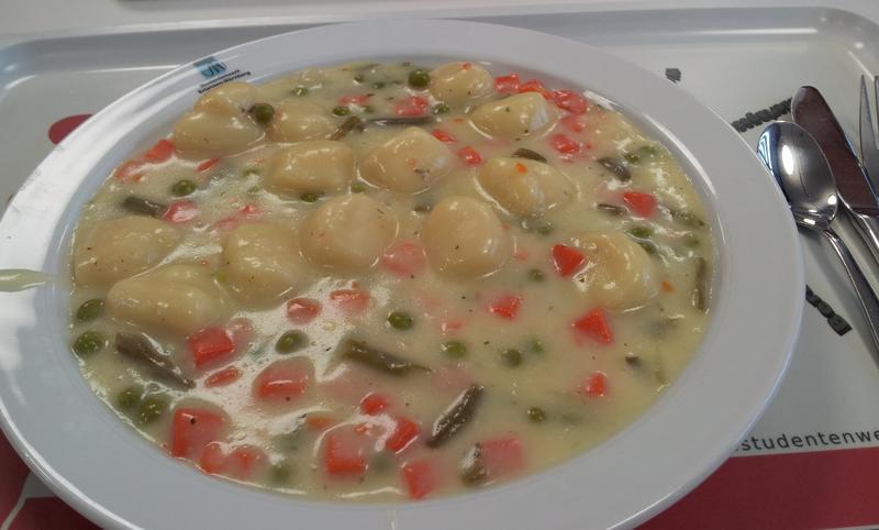 Die Sauce war diesmal echt ekelhaft. Gemusebrühe mit Schleim. Ich esse ja sonst vieles in der Mensa, aber das hier werde ich in Zukunft meiden.