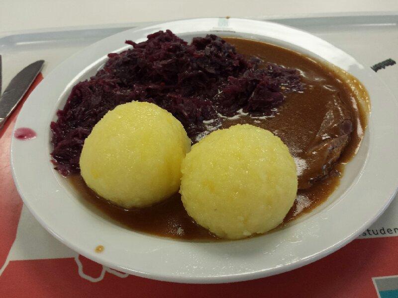 Fleisch etwas zu trocken aber sehr mager, Soߟe und Klos gut. Insgesamt lecker und eines der besten Mensaessen des Jahres