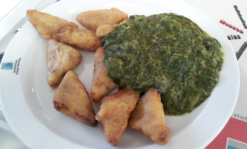 | Wie das Foto zeigt, handelt es sich dabei um frittierte Backteig-Ecken. Deren inneres lässt bisweilen tatsächlich mal irgendwie Spätzle erahnen, auf jeden Fall schmecht es käsig — schon ganz gut essbar. Am Spinat gab es nicht auszusetzen, den hat Käpt'n Iglo gut hinbekommen. | |