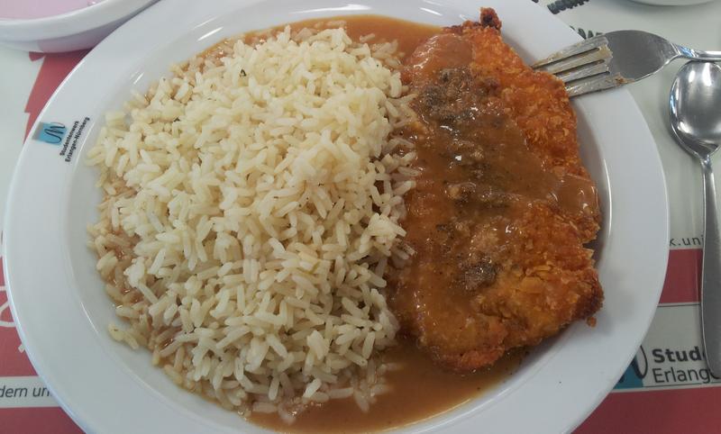 | Hähnchenbrust mit knuspriger Panade, hat gut geschmeckt. Der Reis war der typische Mensareis, macht hal satt, mehr nicht. | |