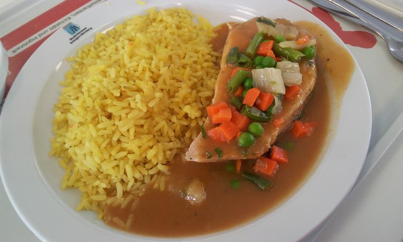 | Typische braune Mensa Soße; Hähnchenbrust war gut, kann man nichts falsch machen; Reis ist halt Reis. | |