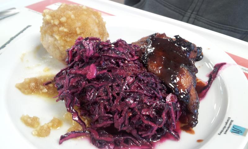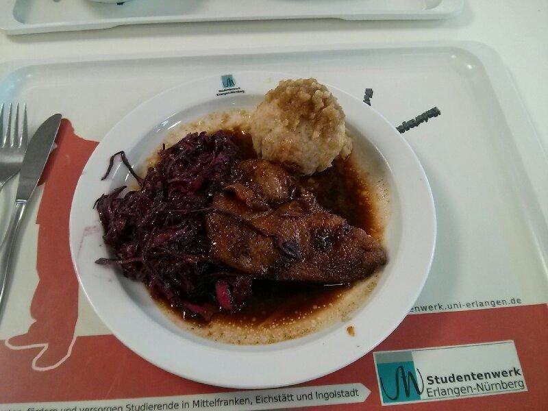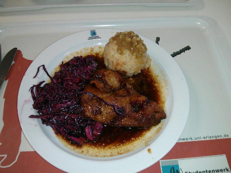 | Ja mei. Erst mal ewig lange Schlange. Warum kann man das Aktionsgericht nicht an zwei Theken ausgeben? Dann zum Essen selber: Die Ente mit labbriger Kruste und staubtrockenem Fleisch, die Semmelnknödeln mal wieder nicht abtropfen lassen, sodass der halbe Teller voller Wasser steht. Die andere Hälfte wird von einer alles erschlagenden "Soße" dominiert. Der Brombeer-Rotkohlsalat war dann ... irgendwie kreativ, aber nichts, was den schlechten Eindruck noch hätte retten können. Die wöchentlich angebotene Entenbrust ist da definitiv um Klassen besser. | |