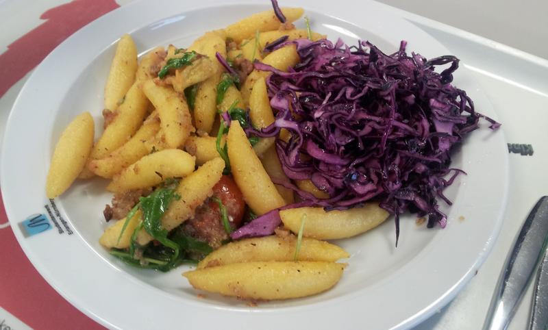 | Gewagte Zusammenstellung für die Mensa. Mir perönlich hats trotzdem sher geschmeckt, obwohl die Schupfnudeln n bisschen zäh waren. | |