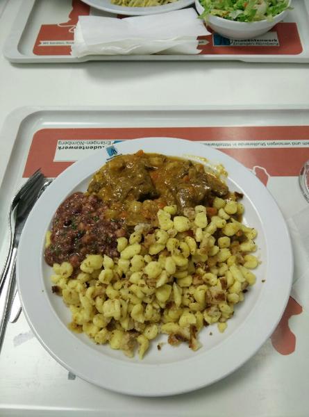| also das gulasch war einfach super. Fleisch schön zart, der Geschmack kräftig und auch das Kompott mit den Nüssen hat gut harmoniert. | |