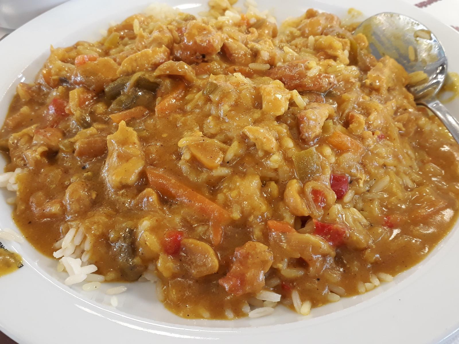 Muss man von zwei Seiten sehen. Einerseits eine leckere Soße, sogar mit halben Erdnüssen drin, andererseits war das Fleisch wirklich schon trocken und auch nicht besonders zahlreich vorhanden. Damit nur 3.5/5 insgesamt.