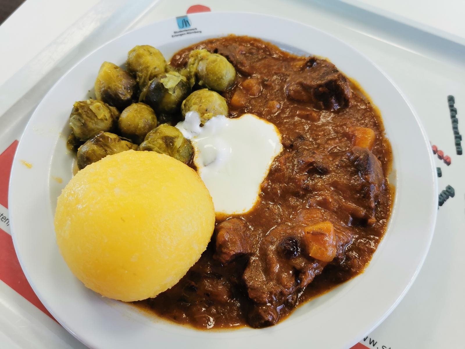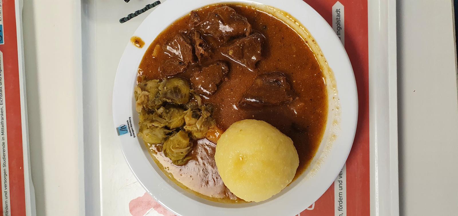 | Soße gut gewürzt, guter Geschmack. Das Ragout war für den Preis auch überraschend gut. Knödel nicht 0berkocht und genießbar. Beim Rosenkohl hört das aber dann auch wieder auf. Sehr weich und ohne biss. Geschmack dennoch okay. 4/5 | |