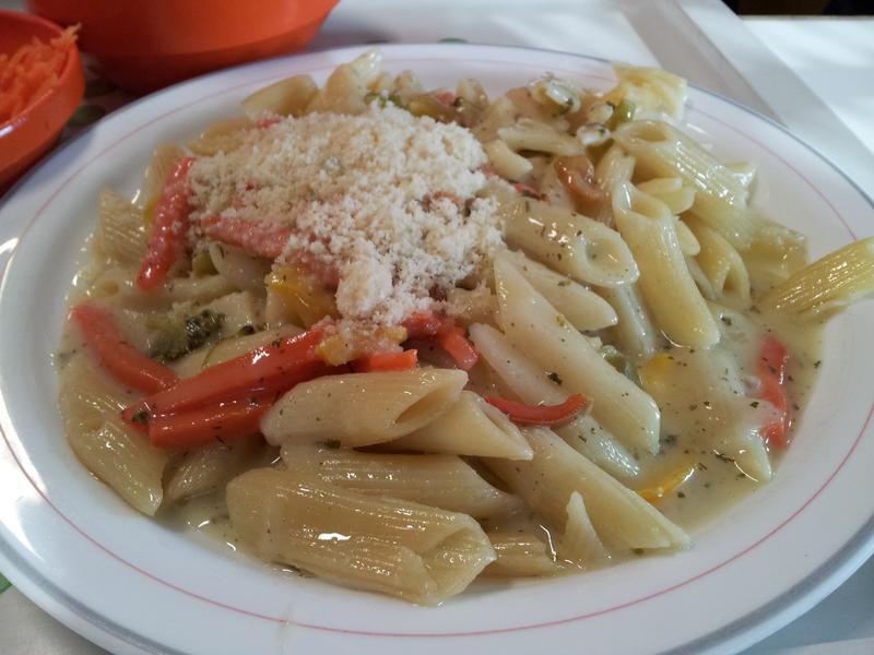 | Die Nudeln sind zufriedenstellend gegart. Die Soße besteht vermutlich aus zerkochtem Gemüse mit geronnener Sahne. | |