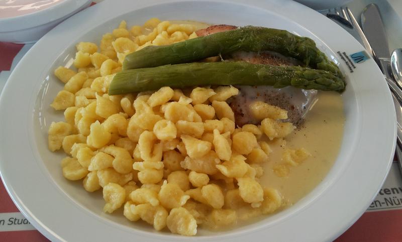 Das Hänchenbrustfilet war richtig weich, beinahe als zart zu bezeichnen und hat gut geschmeckt. Spätzle hatten den gleichen Geschmack wie immer, Soße war relativ gut. Der Spargel war ein bisschen bitter, aber nicht so dass er extrem ekelhaft geschmeckt hätte