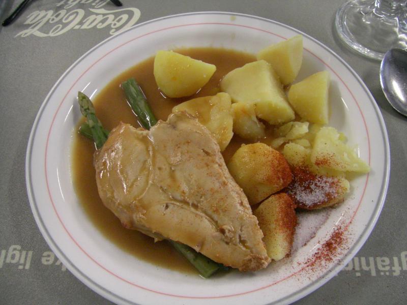 | Vier Staengchen Spargel, holzig und bitter, Haehnchen geniessbar. | |