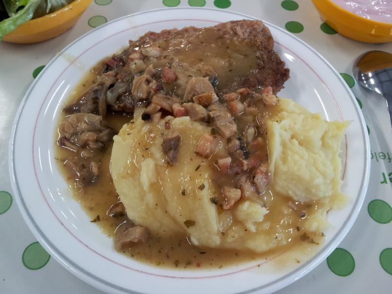 | Fleisch war diesmal sehr zart, ohne Flachsen und mit nur ziemlich wenig Fett. Eigentlich das beste, dass ich innerhalb der letzten Monate in dieser Mensa gegessen habe! Kartoffelbrei war wie immer halt!(-aus der Tüte) | |
