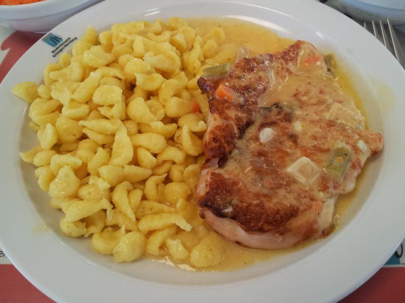 | Wohl eines der besten Mensagerichte überhaupt: Das Fleisch war gleichmäßig durch und die Spätzle waren dank ausreichend Butter auch hervorragend. Fazit: Auch wenn die Ausführung für das Tandoori Chicken jedes mal anders ausfällt, so schmeckt es doch eigentlich immer gut! | |
