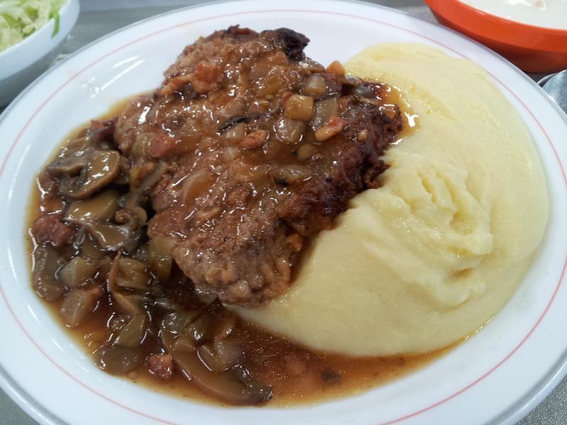 | Sehr gutes, zartes Fleisch. Zwar zerfällt einem das Fleisch auf der Gabel schon fast, aber auf jeden Fall besser, als das zähe Fleisch, das es sonst so in der Mensa gibt. Die Soße war auch überraschend gut, was ich von der Mensa nicht gewohnt bin. Nur der Kartoffelbrei ist leider wie immer aus der Tüte. Alles in allem auf jeden Fall zu empfehlen! | |