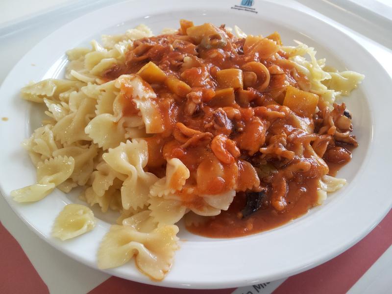 | Die Soße war zwar mensatypisch wässrig, bot dafür aber überraschend viel Geschmack, besonders mit ausreichend Oliven. Untypisch: bei mir gab's Spaghetti, waren nicht verkocht! | |