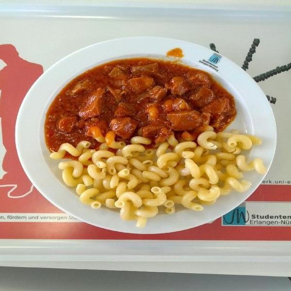 | Ordentliche Portion, das Fleisch war gut und das Gulasch sogar schoen eingekocht und saehmig. Der Aufwaertstrend in der neuen Suedmensa setzt sich fort. Fast unglaublich, aber mittlerweile empfehle ich diese Mensa weiter. | |