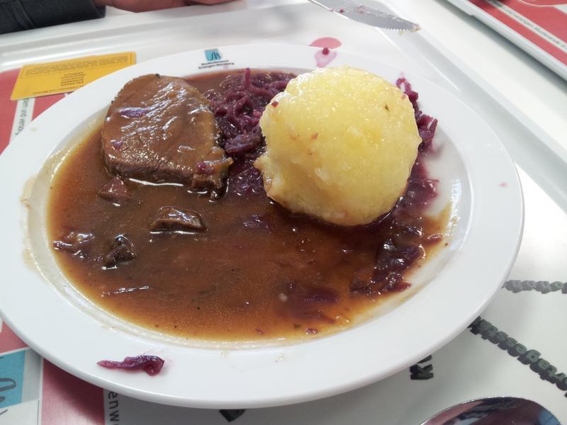 | Das Fleisch war an den meisten Stellen sehr trocken und hart. Wenn man lange genug gesucht hat, konnte man allerdings auch ganz ordentliche Bereiche finden. In Verbindung mit dem Knödel und Soße essbar, auch wenn die Soße zu wenig war. Das Blaukraut war allerdings extrem widerlich. Alles andere als frisch zubereitet und sogar holzig. Das muss allerdings wohl ein Gewürz gewesen sein, oder Absplitterungen vom Kochlöffel weil holziges Blaukraut kann's nicht mal an der Südmensa geben. Der Preis war übrigens wie üblich Betrug, das ganze hat 3,10 gekostet, wenn mich recht erinnere. | |