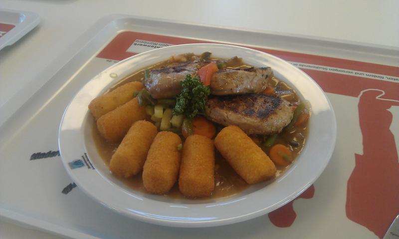 | Die "Bonzenlinie" der Woche, mit wechselnden Sossen (u.a. Paprika, Champignon) und Bohnen-Zubereitungen als Gemüse. Heute gegessen mit Champignon-Speck-sosse, Butterbohnen und Pommes. Sehr lecker und sehr reichlich, ich war danach echt voll. Sicher nicht billig, aber seinen Preis wert gewesen. | |