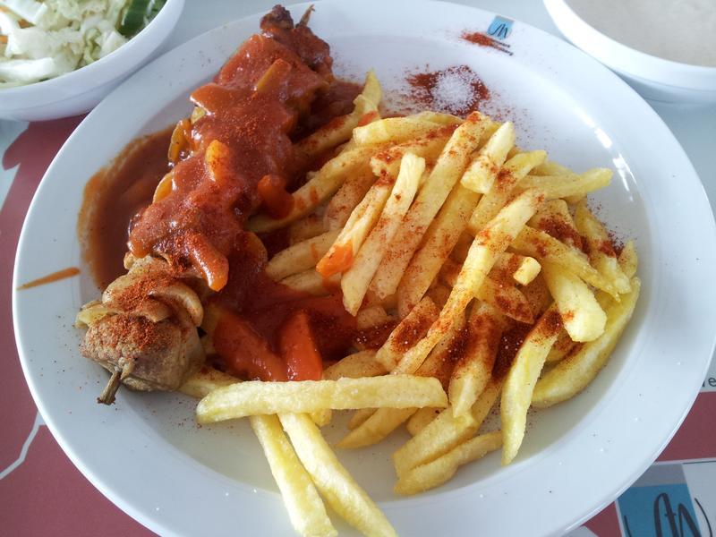 | Der Fleischspieß war extrem trocken und hart! Unter Feuer stell ich mir auch was anderes vor aber da ich eh nicht so scharf esse, gibt es dafür keinen Abzug. | |