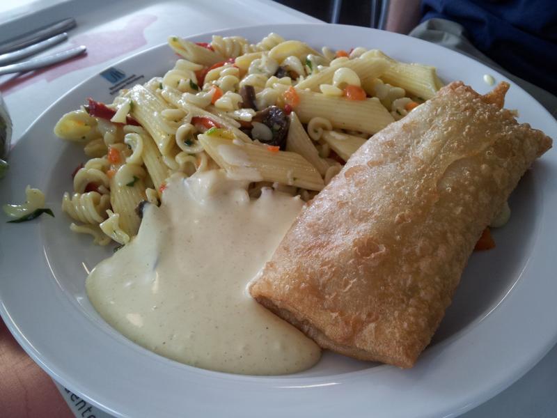 | Paniertes Fleisch mit Spirelli und undefinierbarer roter Soße. Wenn jetzt noch das Hähnchenfleisch durch ne Scheibe Jagdwurst ersetzt wird, sind wir endlich bei den kulinarischen Standards der durchschnittlichen DDR Schulspeisung angelangt. Irgendwo müssen die Schulkochbücher ja nach der Wende hingekommen sein... | |
