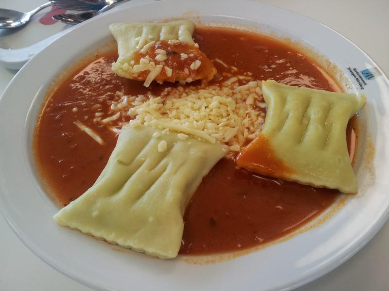 | Dieses mal mit weniger Soße, dafür die relativ gute Arrabiata-Soße und nicht nur Wasser mit roter Farbe. Maultaschen okay - die von Bürger als dem Supermarkt sind allerdings ungefähr doppelt so gut. | |