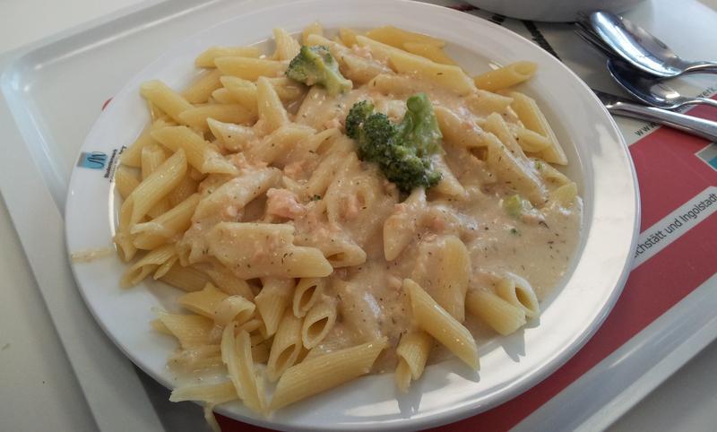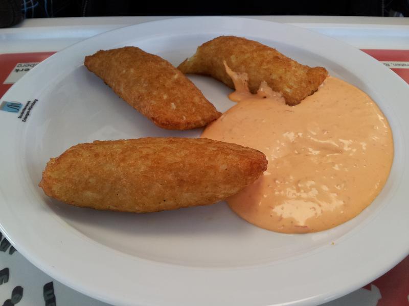 | Essen war aus, stattdessen gabs kaltes Schnitzel mit Reis und der wunderbaren Mensakreation einer Soße... Die Senf-Zwiebelsoße passt einfach überhaupt nicht zu paniertem Schnitzel! | |