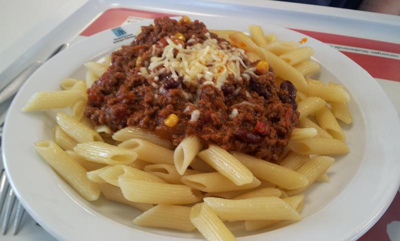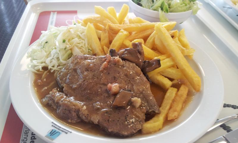 | Das Gericht sah gut aus und schmeckte erstaunlicherweiße auch so. So gut habe ich bis jetzt nur selten in der Mensa gegessen. Dieses Mal gab es Pommes dazu, man kann also nichtmal etwas gegen den Kartoffelbrei sagen. | |