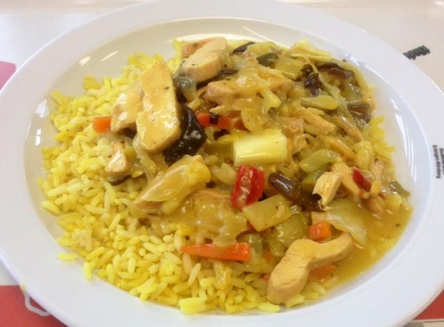 | Was actually edible. The rice is not gebraten.. it is simply orange/yellow coloring. But it is understandable since they had to feed so many. There wasn't enough vegetables though. But I wouldn't mind eating this again. | |