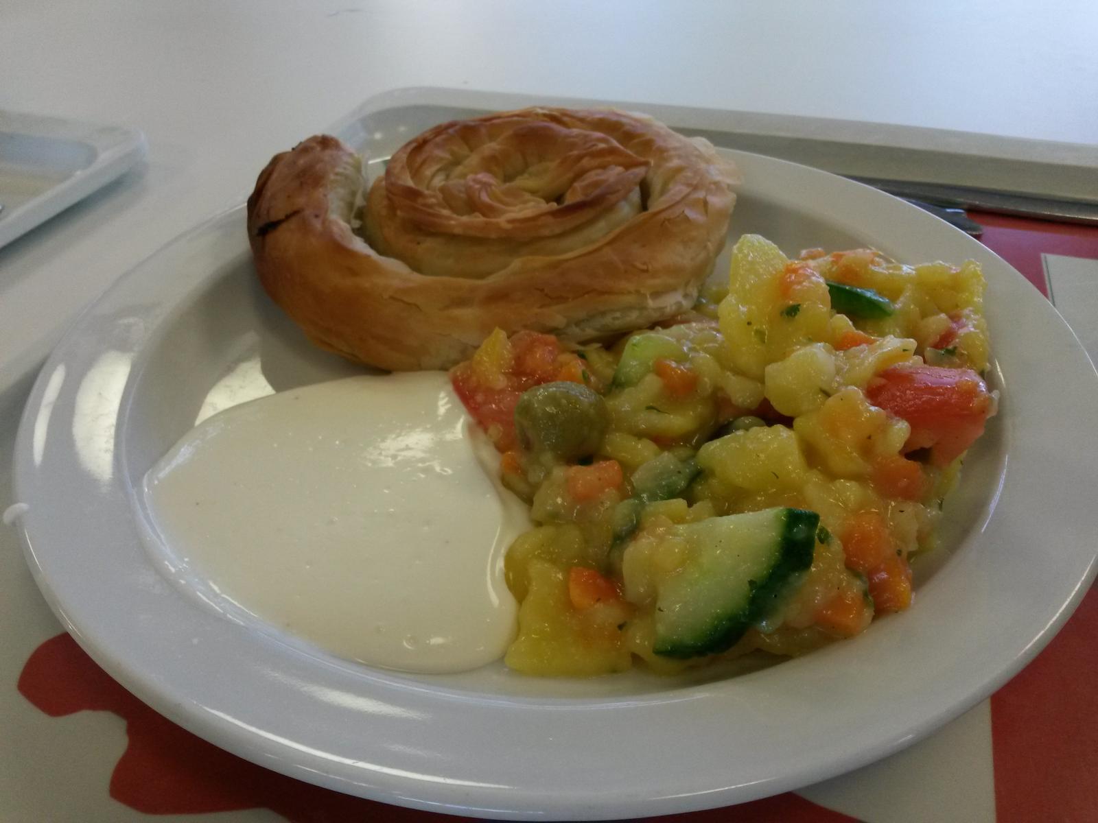 | Krasser Kontrast zu Rotkohl und Braten -- aber ganz lecker. Zum Glück war genug Dip dabei, sonst wäre das Börek sehr trocken gewesen. Kartoffelsalat top! | |