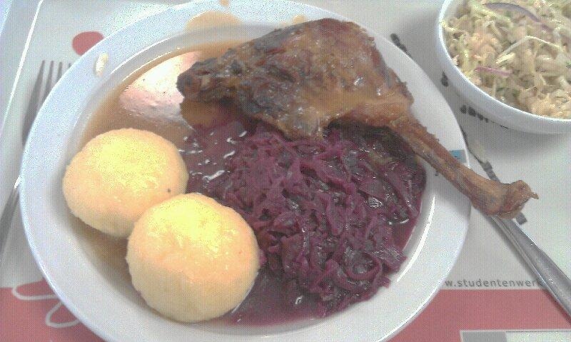 (81)| Das Weihnachtsessen war, wie die letzten Jahre, wieder sehr lecker, für 5,55¤ eine satt machende Mahlzeit. Nur die Soße war bereits nach dem ersten Kloß komplett aufgebraucht, hier könnte die Mensa durchaus einen zweiten Schöpfer austeilen oder mal größere Kellen anschaffen. | |