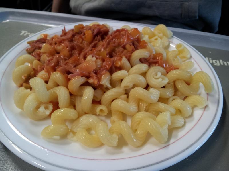 | Heute wieder mit Gemüse, schön! Es war ne Hähnchenbrust (ohne Panade), war okay, war durch. Gelber Reiß ganz gut gewürzt, Soße etwas fahl, aber okay. War mit Salz und Pfeffer zu verbessern. | |