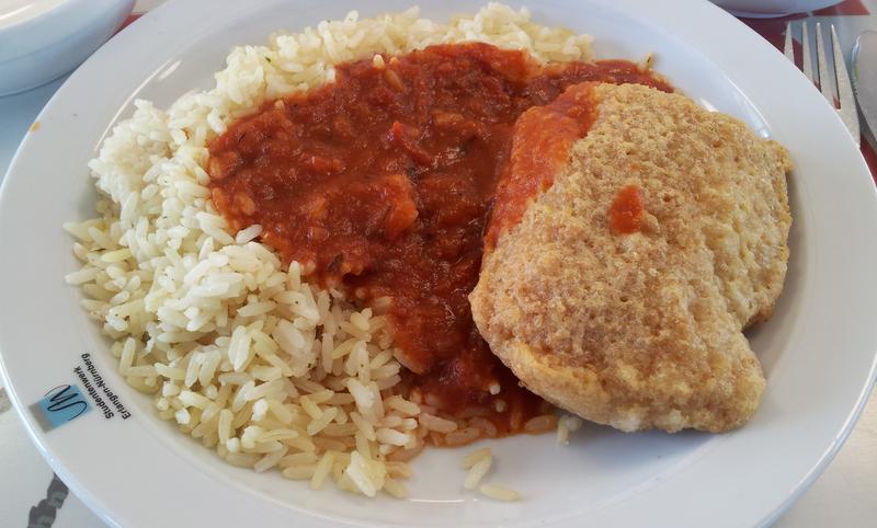 | Freitags gibt es immer Fisch, also her mit dem Fisch! Der Seehecht war eine gelungene Abwechslung zu Lachs oder Scholle, man hat den Unterschied deutlich geschmeckt. Richtig leckerer Fisch, hat mir sehr gefallen! Die Pannade war allerdings etwas labbrig und merkwürdig, dafür gibt es einen Stern Abzug. Die Soße war gut, der Reis nicht weiter ungewöhnlich. | |