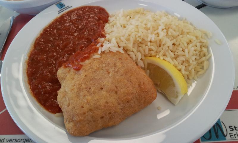 | Freitags gibt es immer Fisch, also her mit dem Fisch! Der Seehecht war eine gelungene Abwechslung zu Lachs oder Scholle, man hat den Unterschied deutlich geschmeckt. Richtig leckerer Fisch, hat mir sehr gefallen! Die Pannade war allerdings etwas labbrig und merkwürdig, dafür gibt es einen Stern Abzug. Die Soße war gut, der Reis nicht weiter ungewöhnlich. | |