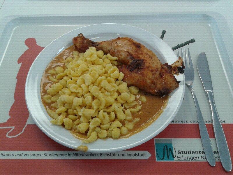 | Hähnchenkeule wie immer solide, interessante neue Soßenkreation, die gut passt und gut schmeckt. Langsam gehts mit der Mensa wieder ein bisschen bergauf... | |