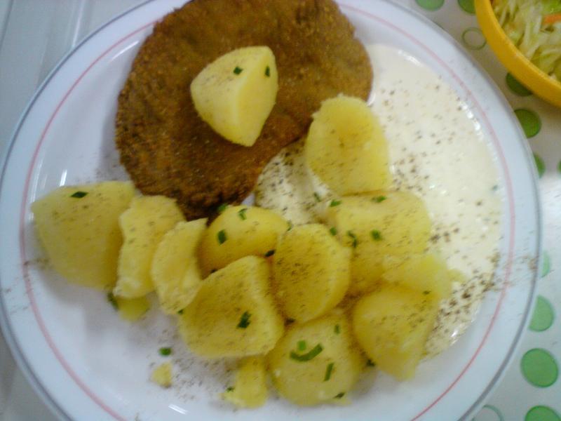 (126)| Imho eines der besseren Mensagerichte, heute sogar als geradezu reichhaltige Portion. "Ei-Dip" ist nur ein weiterer Name für die Standard-Mensa-Joghurtsoße. | |