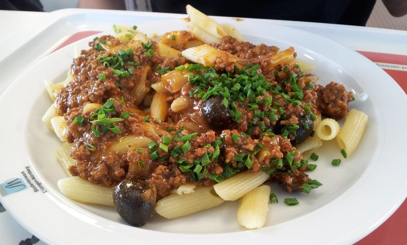 | Nudeln gut; Hackfleischsoße gut, viel Hackfleisch aber Gemüse undefinierbar; Empfehlung, hätte aber mehr sein dürfen | |