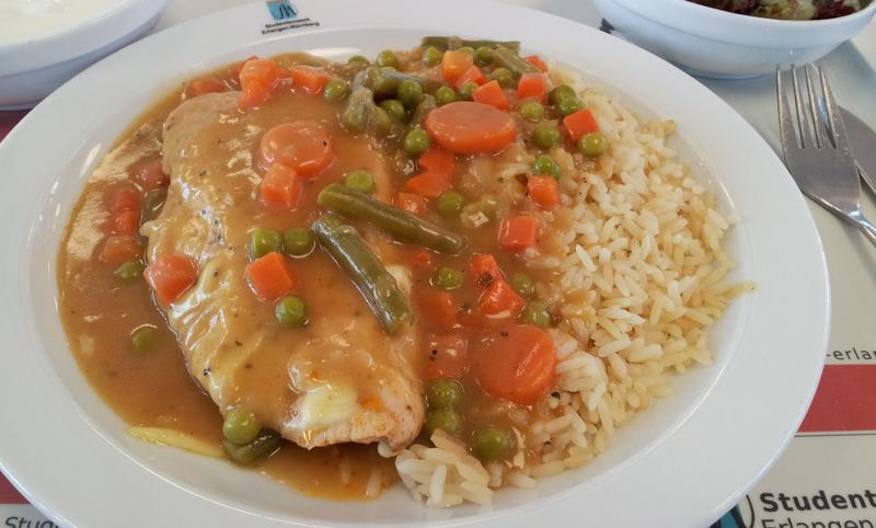 | Für Mensaessen überraschend gut! Fleisch etwas farblos aber geschmacklich gut. Soße sehr lecker. Nur der Reis war etwas trocken und hart. | |