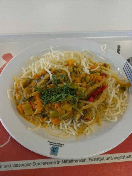 | Portion war für Mensaverhältnisse erstaunlich groß und hat auch satt gemacht. Das Essen war allerdings sehr schlecht gewürzt und hat nach gar nichts geschmeckt. Die Sojawürfel hätte man auch aussortieren können. | |