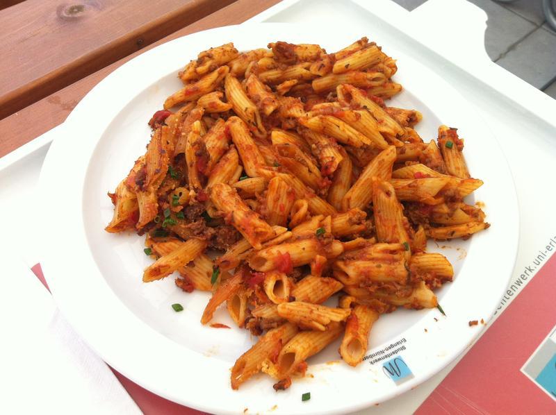 | wie so oft bei der Mensa: hätte man den letzten Arbeitsschritt weggelassen, sprich die Nudeln mit Hackfleischsoße nicht gewalttätig mit Reibekäse zu überbacken bis sie steinhart sind, hätte aus dem Gericht sogar was gutes werden können... | |