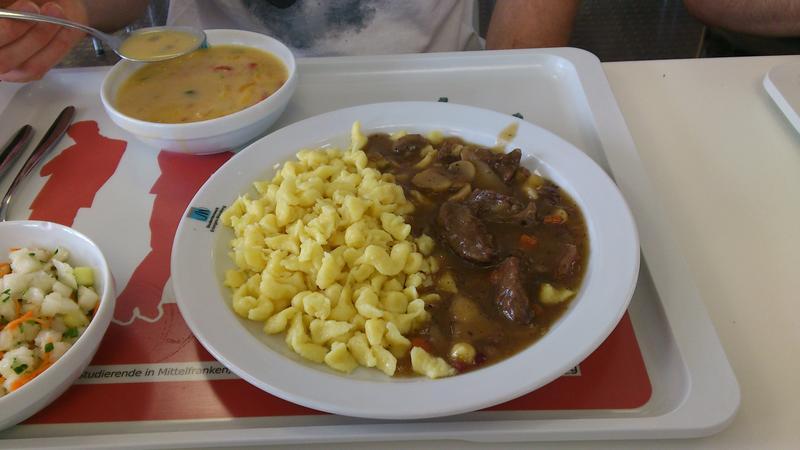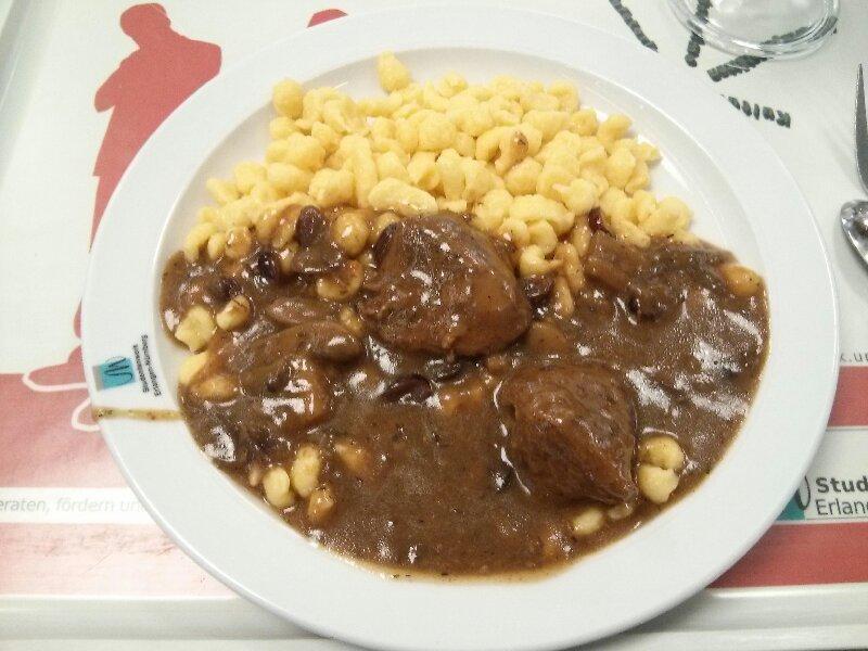 | Schmeckt ein wenig weihnachtlich (komisch gewürzt), aber durchaus noch stark nach dem, was an Zutaten auszumachen war. Fleisch gut, der Kloß auch lecker. In Summe eines der besten Essen, die die Mensa mir bisher geboten hat. Unbedingt probieren! | |