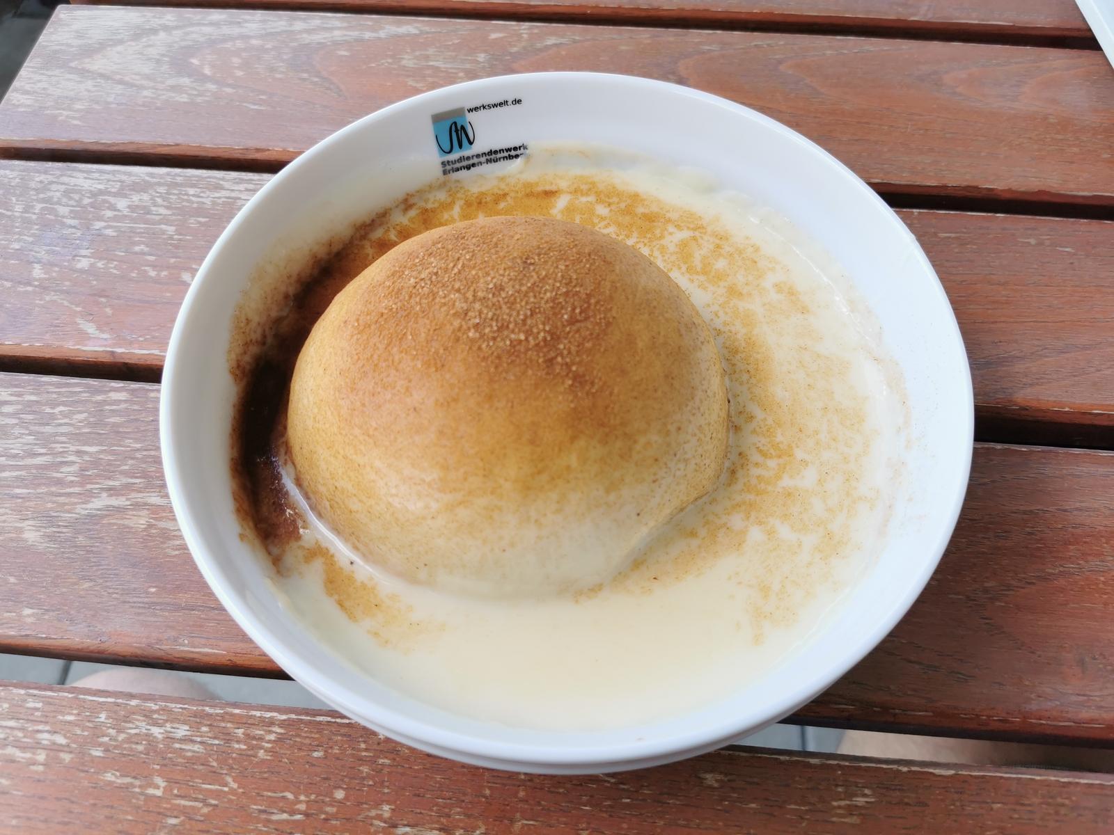 | Germknödel mit Zwetschgenkompott gefüllt - hab ich mir gegönnt! Vanillesoße auch gut. Ein Gericht bei dem man eigentlich nichts falsch machen kann. War zwar kein Mohnzucker zum Draufstreuen wie auf dem Bild, aber Zimtzucker is auch ok. | |