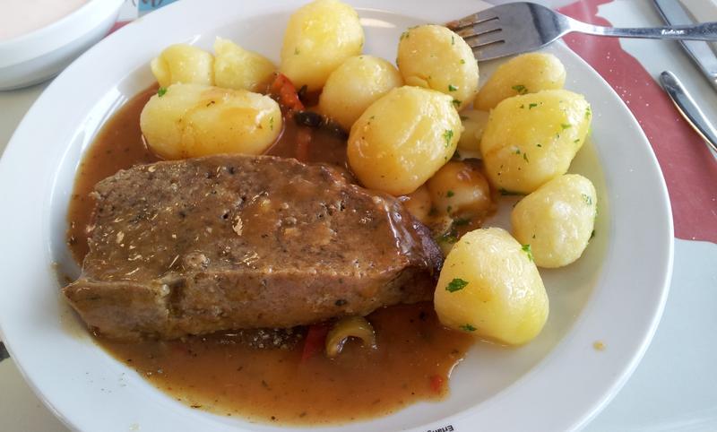 | Ich hatte Hackbraten, der war etwas trocken, was womöglich daran liegt dass er schon länger stand. Geschmacklich aber tiptop, für mich besser geeignet als das Hacksteak. | |