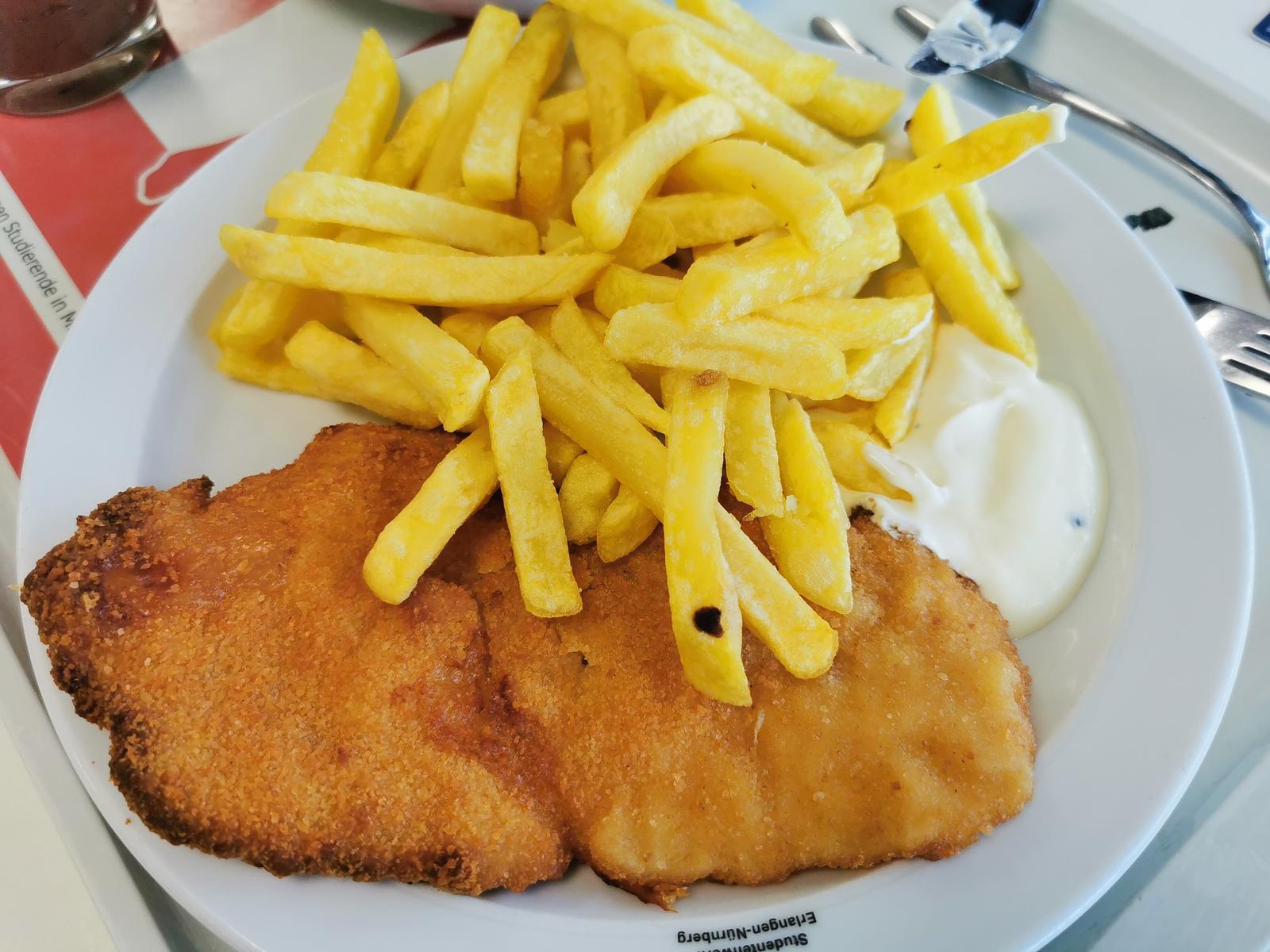 | Habs mit Pommes bekommen. das schnitzel war genau richtig, pommes nicht zu trocken aber weng lappat. insgesamt hats basst. | |