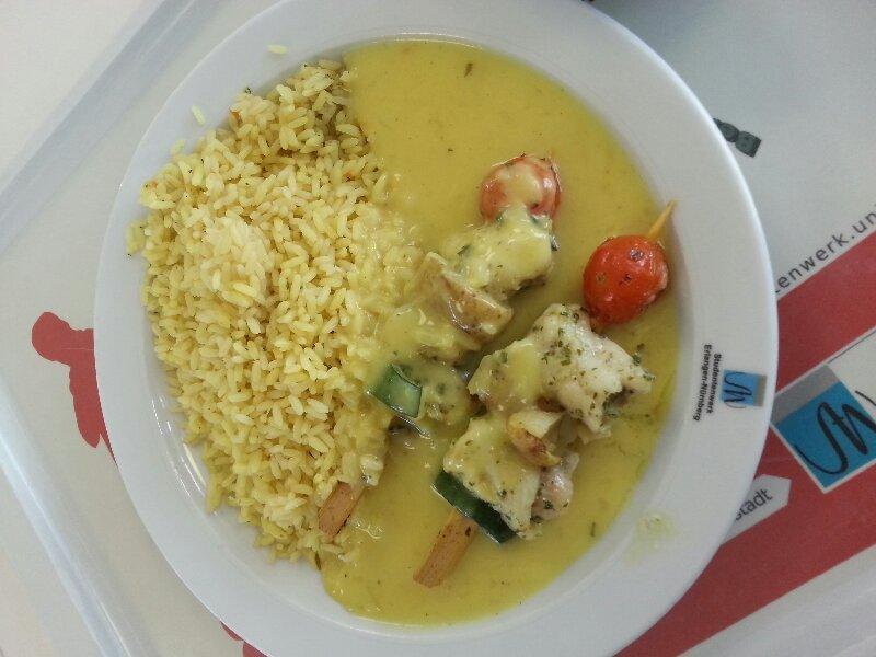 | Fleisch fand ich recht gut. Die Dipmenge ist relativ zum Reis gesehen allerdings schlecht gewählt. Der Reis alleine ist aber doch sehr trocken. Curry-Reis ist offensichtlich nur eine Farbbezeichnung. Geschmacklich konnte ich keinen wirklichen Unterschied zu normalem Reis feststellen. | |