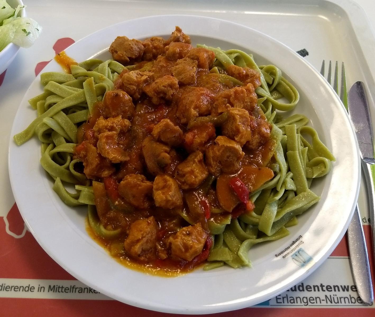 | Das vegane Gulasch ist super, auch die Portionsgröße stimmt, nur die Nudeln sind fade und matschig | |
