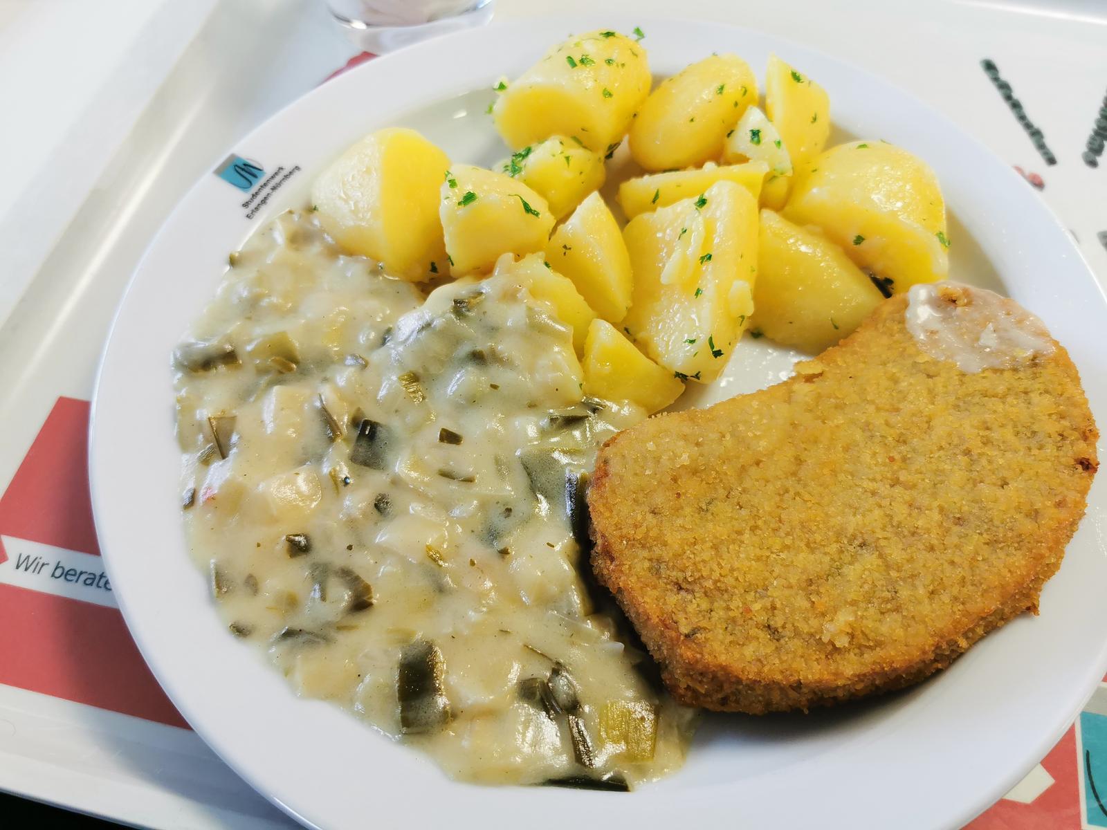 | Die Kombination aus Rahmlauch und Kartoffeln war ganz lecker, das Sellerieschnitzel hätts aber in meinen Augen nicht gebraucht - Mensa-typisch mit zu dicker, matschiger Panade ;) | |