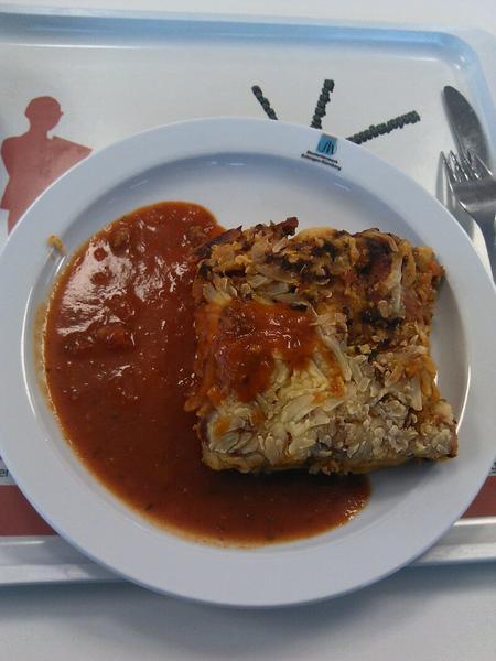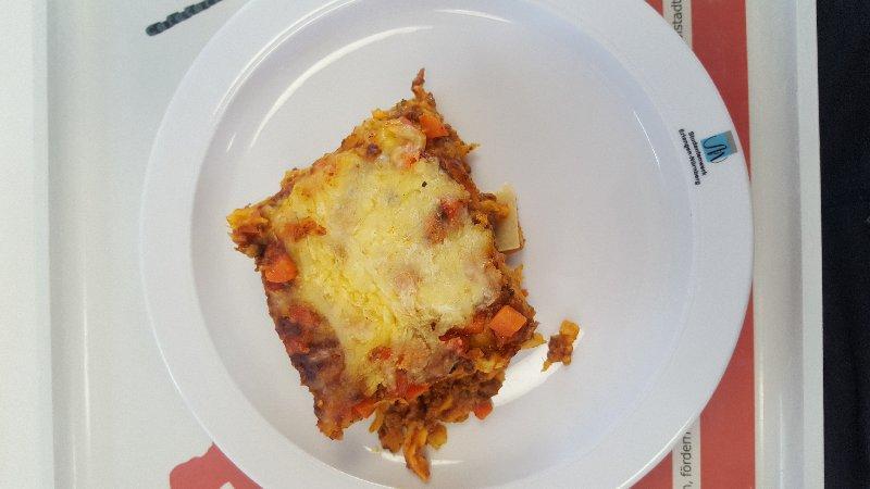 Eine für die Mensa überdurchschnittlich gute Komposition aus bissfesten Nudeln und Geschmacksnuancen die einem selbstgemachte Essen nahekommen. Einzig nachteilig die schier große Menge an Fett die benutzt wurde.