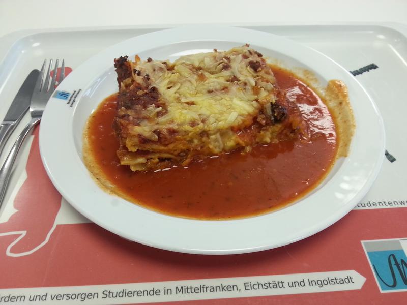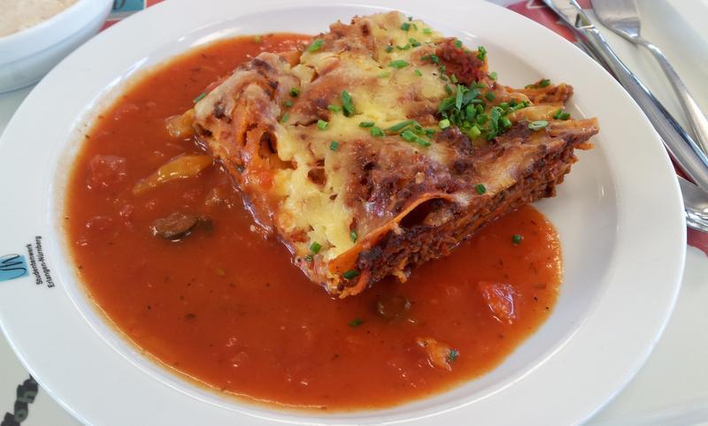 Sehr gute Lasagne, leider von Tomatensoße ertränkt. Nächstes mal lieber ein größeres Stück dafür ohne Soße...