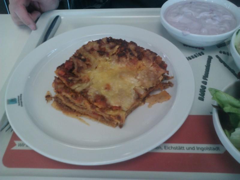 Positiv: Echte Béchamel- und Bolognesesoße. Leider etwas wenig davon, deswegen war es etwas trocken. Mit nem Salat dazu gings schon. 3/5 mit Potential nach oben.