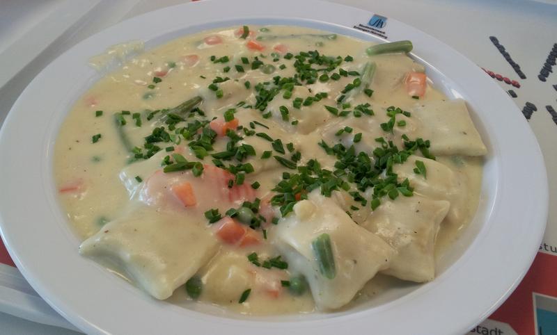 | Keine Ahnung, mit was die Dinger gefüllt waren, die Soße war aber besser als die gefürchtete übliche Gemüsesoße. | |